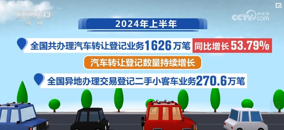 在二手车交易方面,2024年上半年,全国共办理汽车转让登记业务1626万笔,同比增长53.79%,汽车转让登记数量持续增长。全国异地办理交易登记二手小客车业务270.6万笔,二手车异地交易登记改革措施在便利群众企业办事、促进二手车流通方面效果明显。