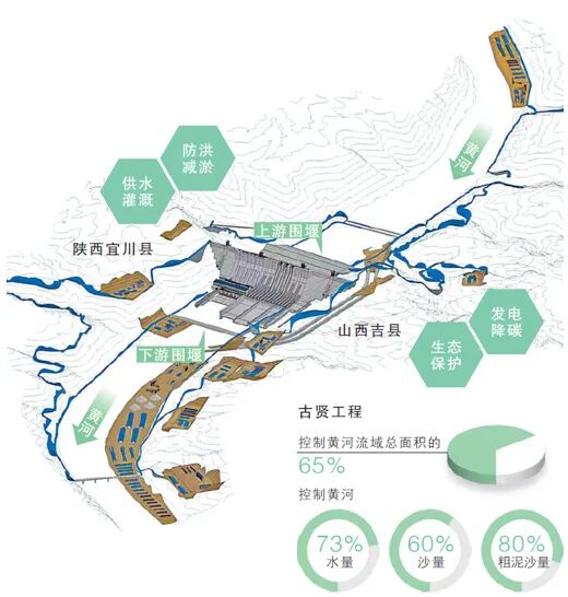 大坝耸立,拦截泥沙。黄土高原是黄河中下游河道泥沙主要来源,扼守黄河中游的古贤工程,可控制黄河60%的沙量和80%的粗泥沙量。