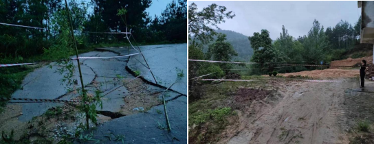 6月27日上午,蕲春县张塝镇瓢铺村灾害风险隐患信息报送员吴思文在对本村十一组鸡公尖滑坡(在册隐患点)进行巡排查时,发现水泥道路出现变形裂缝,立即上报。村委会立即组织直接受威胁的2户2人转移,划定危险区域。18时17分,该隐患点安装的裂缝监测设备出现预警通知,村负责人向上级报告相关情况后,迅速组织人员前往现场查看情况,发现隐患点路面出现断裂,山体有移位迹象。镇里接报后,经过研判,再次转移1户1人。同时,对风险区域拉警戒线、道路实行封闭管理,在外围竖立灾害风险警示牌,通过电话、微信通知村民注意规避风险,禁止到相关区域作业活动;组织党员干部值班值守,对山体裂缝的变化做好监测。