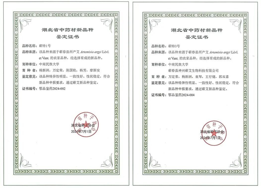 由中南民族大学药学院万定荣、杨新洲两位教授分别牵头选育的两个蕲艾新品种“蕲特1号”和“蕲特3号”,均获得湖北省中药材新品种鉴定证书。