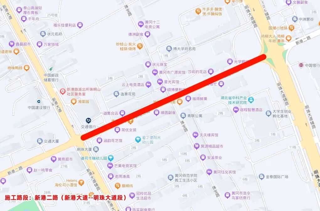 因黄州区新港二路(新港大道-明珠大道段)片区排水防涝改造工程需施工,为保障施工安全。现决定于2024年07月19日至2024年10月30日进行封闭施工。