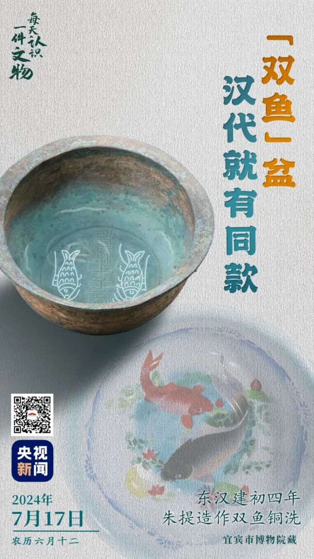 这件东汉“双鱼”盆是古人生活中常见的一种盥洗器具,由青铜铸造而成。双鱼铜洗内底铸有“建初四年朱提(shū shí)造作”八字篆书铭文,铭文两侧装饰了镜面对称的双鱼图案。工匠用简洁的线条勾勒出鱼身、鳞、鳍等细节,鱼嘴旁的四道水波纹增添了生动感。