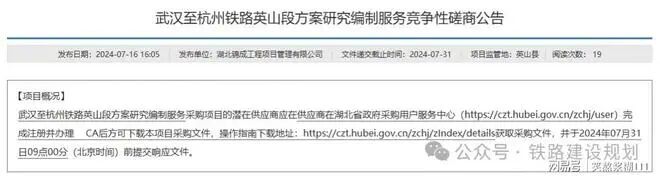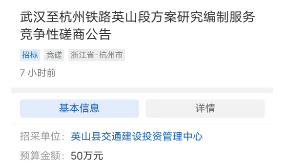 7月16日,英山县交通建设投资管理中心发布了《武汉至杭州铁路英山段方案研究编制服务竞争性磋商公告》,将正式启动项目前期研究工作。