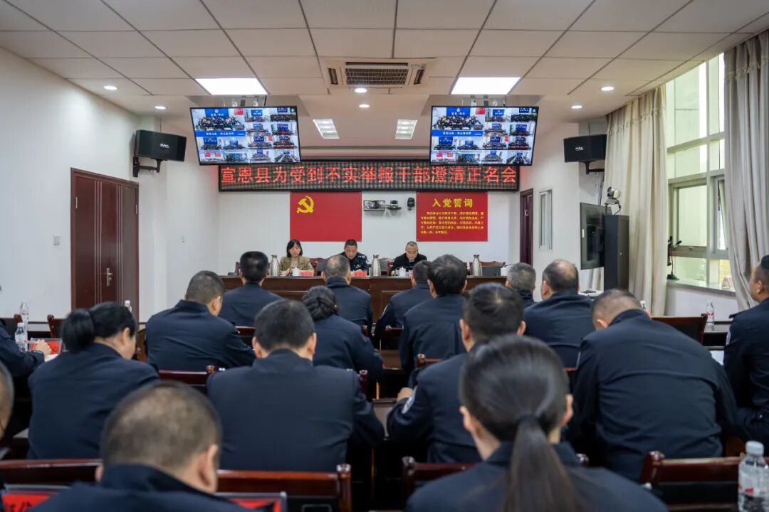 ▲宣恩县公安局为民警段某新、陈某利“伪造询问笔录、办冤案假案”不实举报召开澄清正名会。