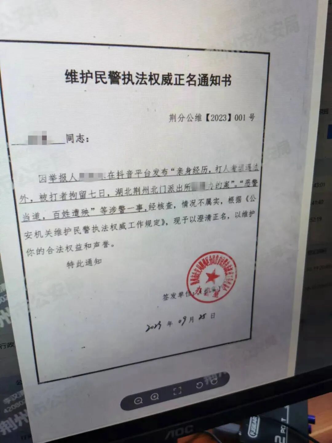 ▲荆州市公安局荆州区分局为受诬告民警发放的《维护民警执法权威正名通知书》。