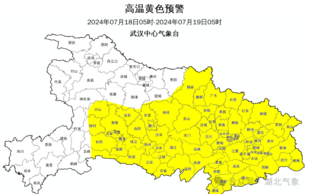 预计今天白天,宜昌、荆门、荆州、天门、潜江、仙桃、随州、孝感、武汉、鄂州、黄冈、黄石、咸宁最高气温将升至35℃以上,局地37℃以上,请注意防范。