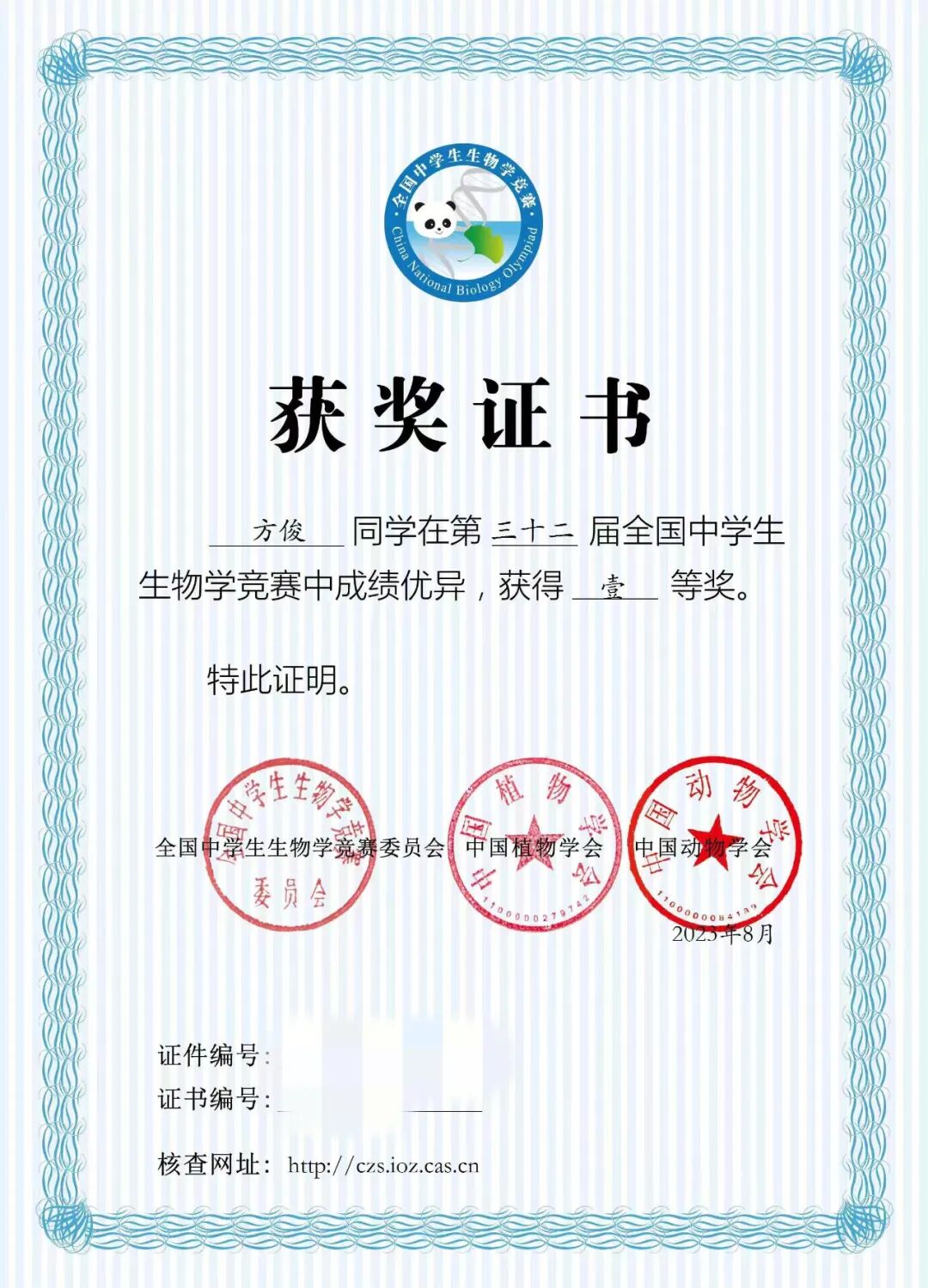 方俊在全国中学生生物竞赛中获得一等奖