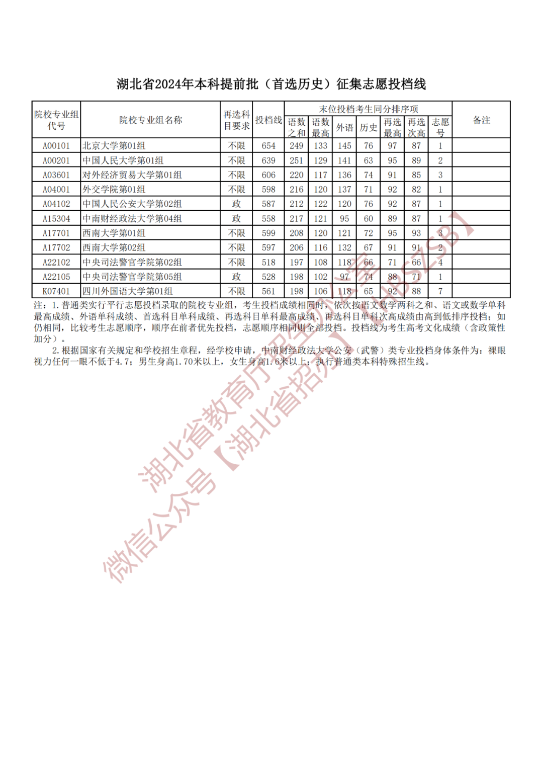 新一批投档线公布湖北省2024年本科提前批(首选历史)征集志愿投档线
