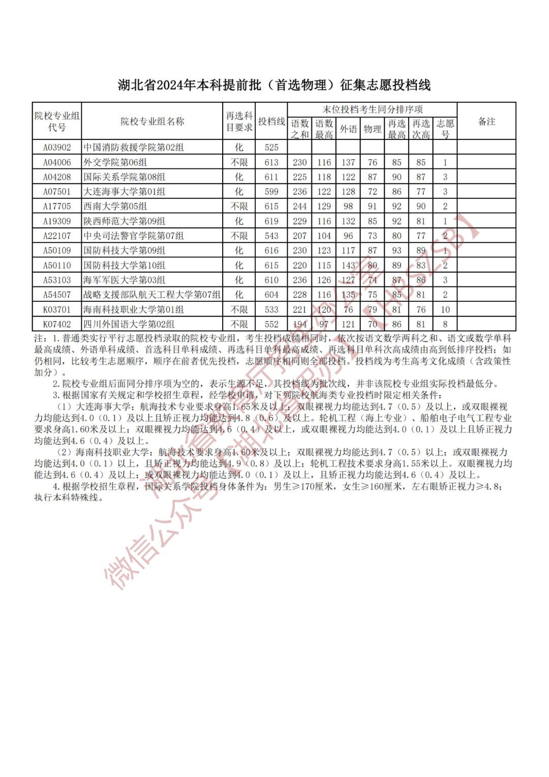 湖北省2024年本科提前批(首选物理)征集志愿投档线