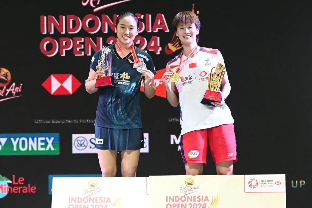 6月9日,陈雨菲(右)和安洗莹在颁奖典礼上合影。当日,在雅加达举行的2024年印度尼西亚羽毛球公开赛女单决赛中,中国选手陈雨菲2比1战胜韩国选手安洗莹,夺得冠军。新华社发(维里摄)