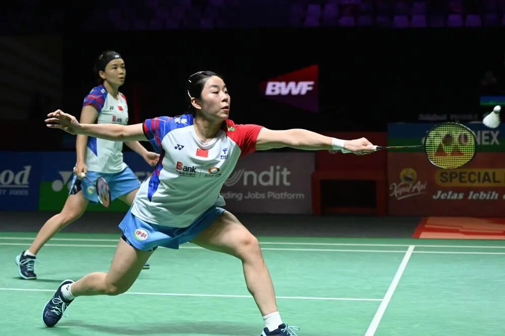 6月9日,陈清晨/贾一凡(前)在比赛中。当日,在雅加达举行的2024年印度尼西亚羽毛球公开赛女双决赛中,中国组合陈清晨/贾一凡0比2不敌韩国组合白荷娜/李绍希,获得亚军。新华社发(维里摄)