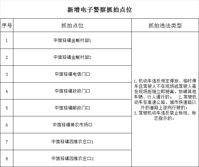 自2024年9月1日起在麻城市区域内的部分路口、路段新增启用电子警察交通违法抓拍系统,对违反禁令标志指示、违反禁止标线指示、逆向行驶、违反禁止标志停车等交通违法行为进行自动抓拍并依法处理。