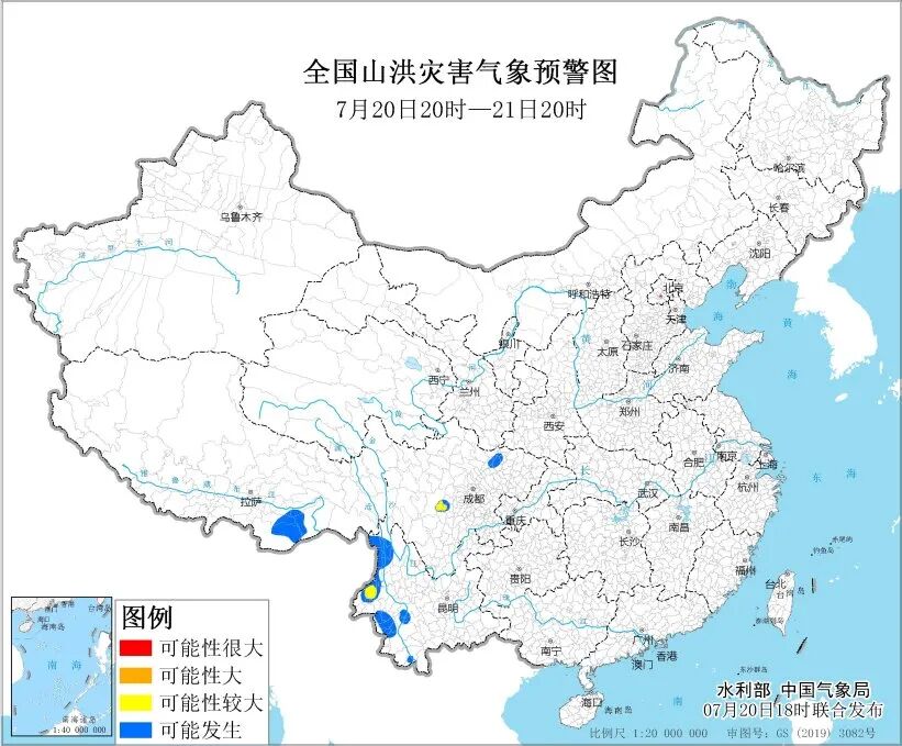 水利部和中国气象局20日18时联合发布黄色山洪灾害气象预警:预计20日20时至21日20时,四川中部和东北部、云南西部和南部、西藏东南部等地部分地区可能发生山洪灾害(蓝色预警),其中,四川中部、云南西部局地发生山洪灾害可能性较大(黄色预警)。
