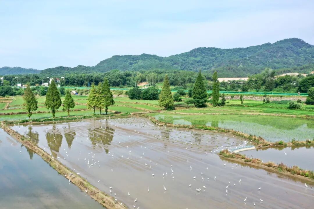 安徽省太湖县,成群白鹭栖息于农田中,绘就田园画卷。刘辉 摄