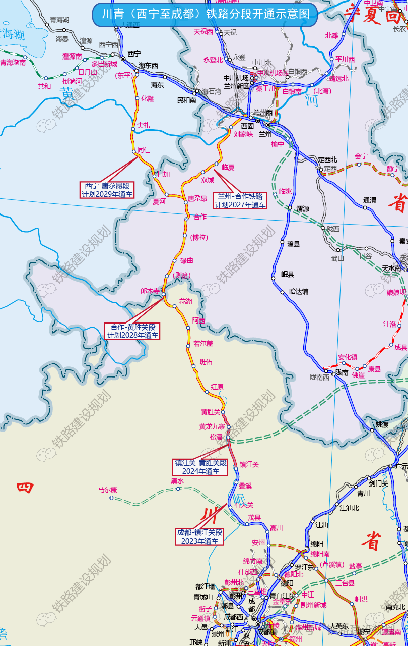 川青铁路全长836公里,是我国“八纵八横”高铁网第八纵兰(西)广通道的组成部分。由原成兰铁路成都至黄胜关段和在建西成铁路西宁至黄胜关段组成。
