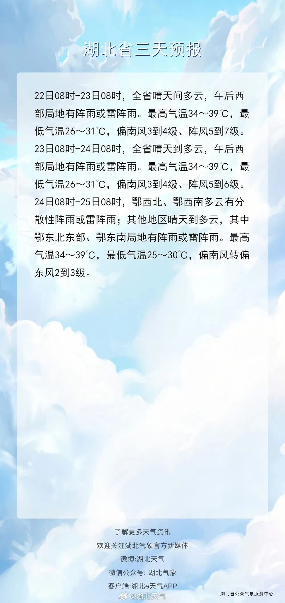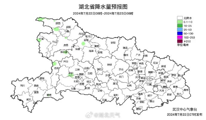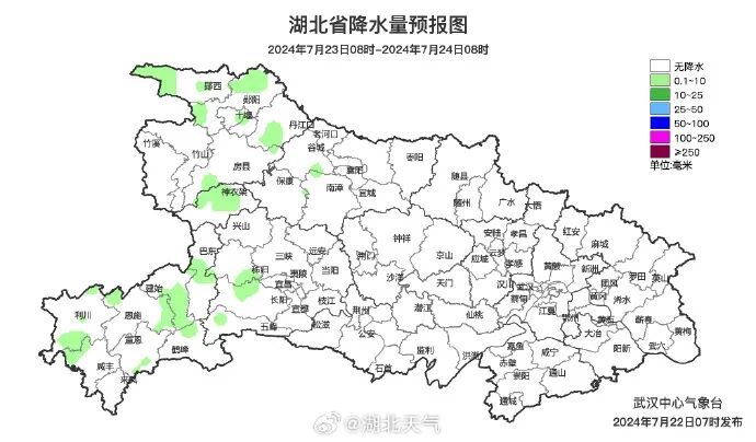 湖北省未来三天降雨落区色斑图预计7月22日至24日全省大部分地区将维持高温天气午后西部局地有阵雨或雷阵雨