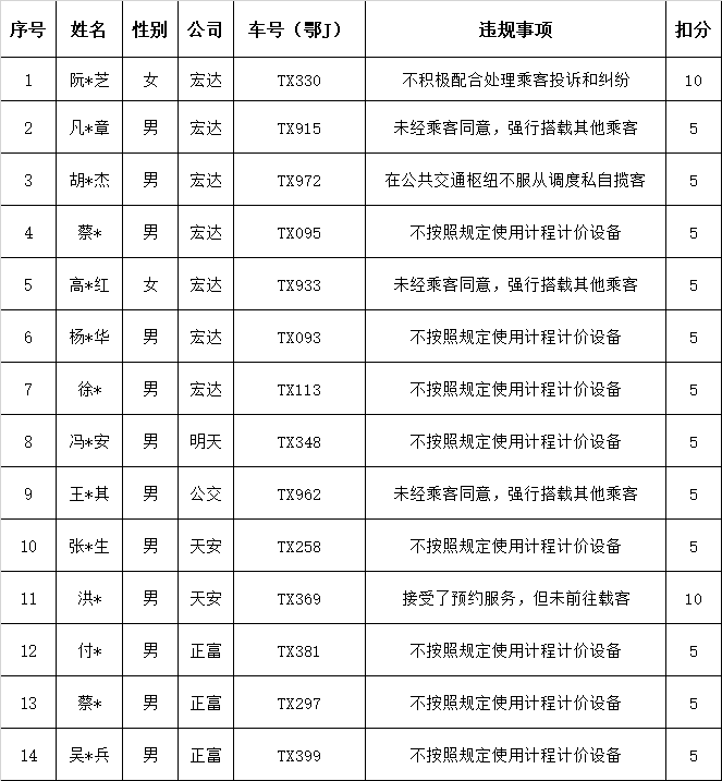 对上黑榜驾驶员提出批评,希望他们规范经营,文明服务,进一步提升服务水平,加油!