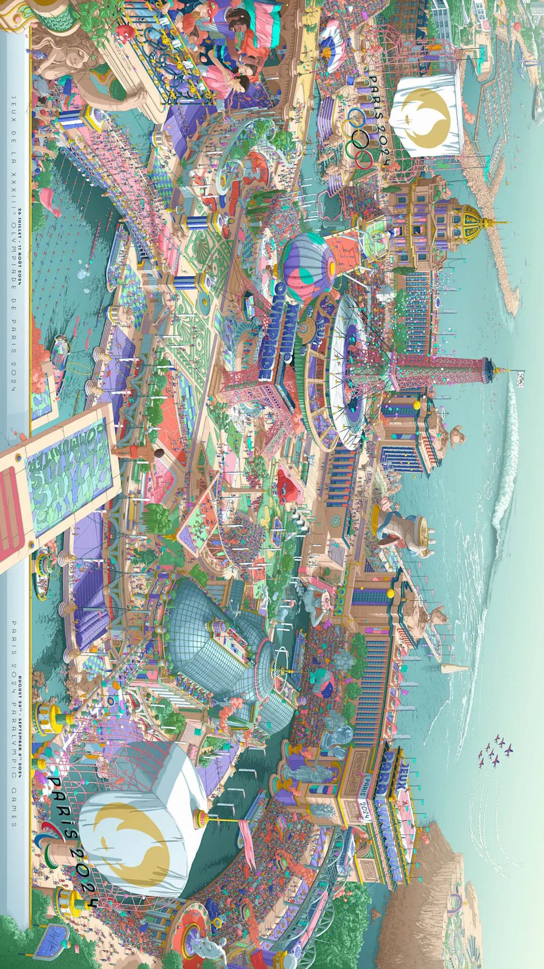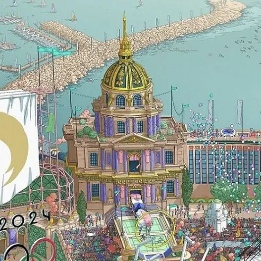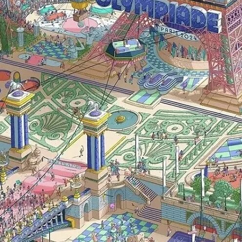 本届奥运会海报描绘了一个多元且繁华的微观世界——一座巨大的城市体育场,无数巴黎元素被有趣呈现。