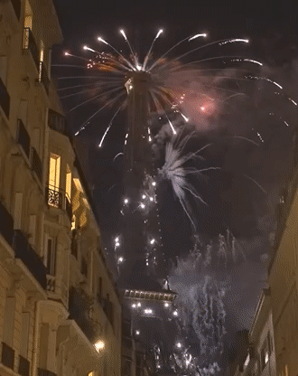△今年7月14日法国国庆节,埃菲尔铁塔绽放焰火。