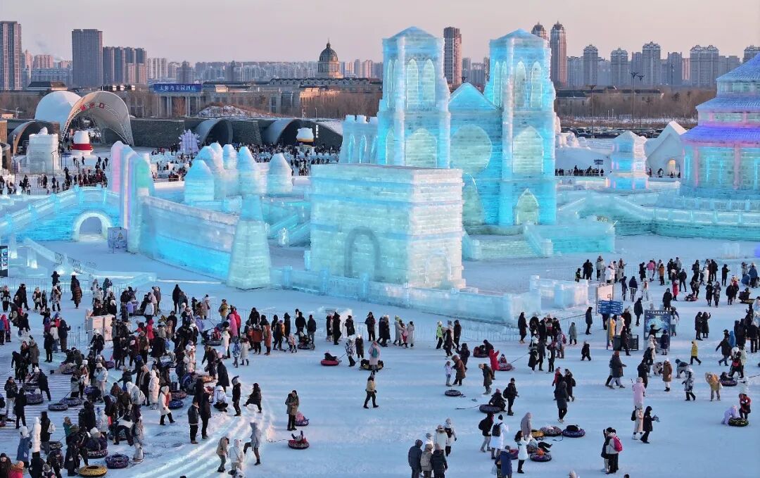 △黑龙江哈尔滨冰雪大世界中的法国建筑冰雕。