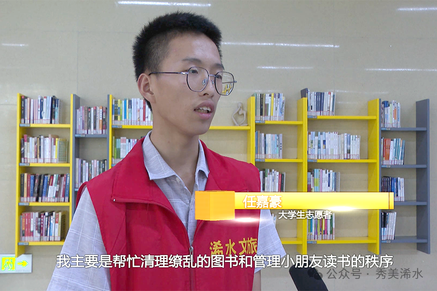 大学生志愿者 任嘉豪:在图书馆,我主要是帮忙清理缭乱的图书和管理小朋友读书的秩序,不能让小朋友因为跑步和大声喧哗影响其他读者看书,也要保证其他小朋友不能在图书馆内因为跑步急跌倒而受伤。