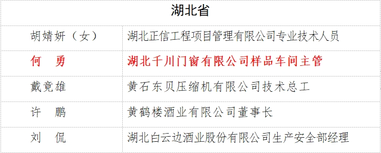 近日,国家人社部发布了全国轻工行业劳动模范和先进工作者拟表彰对象名单公示,湖北省共入选5名国家级劳动模范,其中来自我市湖北千川门窗有限公司样品车间主管何勇光荣上榜。