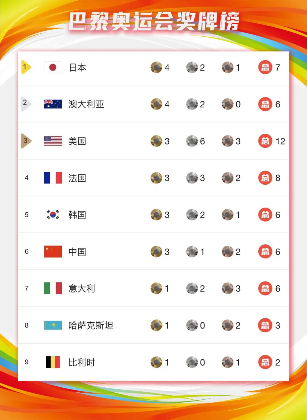 截至巴黎奥运会第二个比赛日,中国代表团共获得3金1银2铜,暂列金牌榜第六。