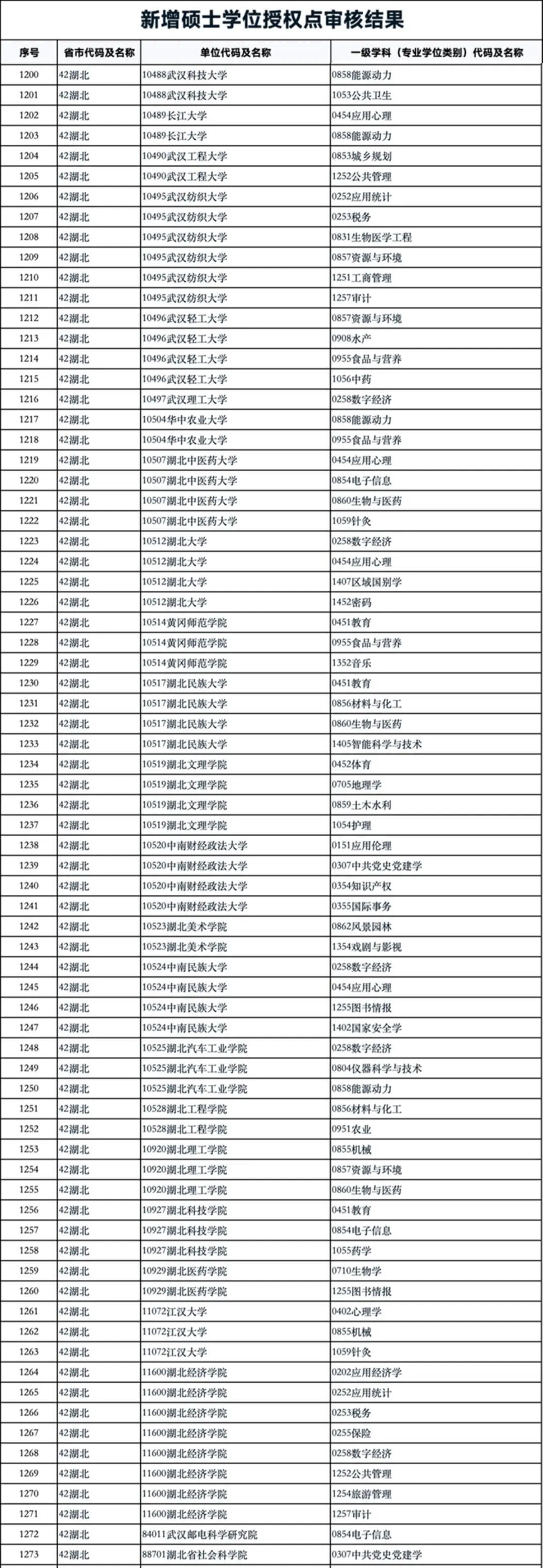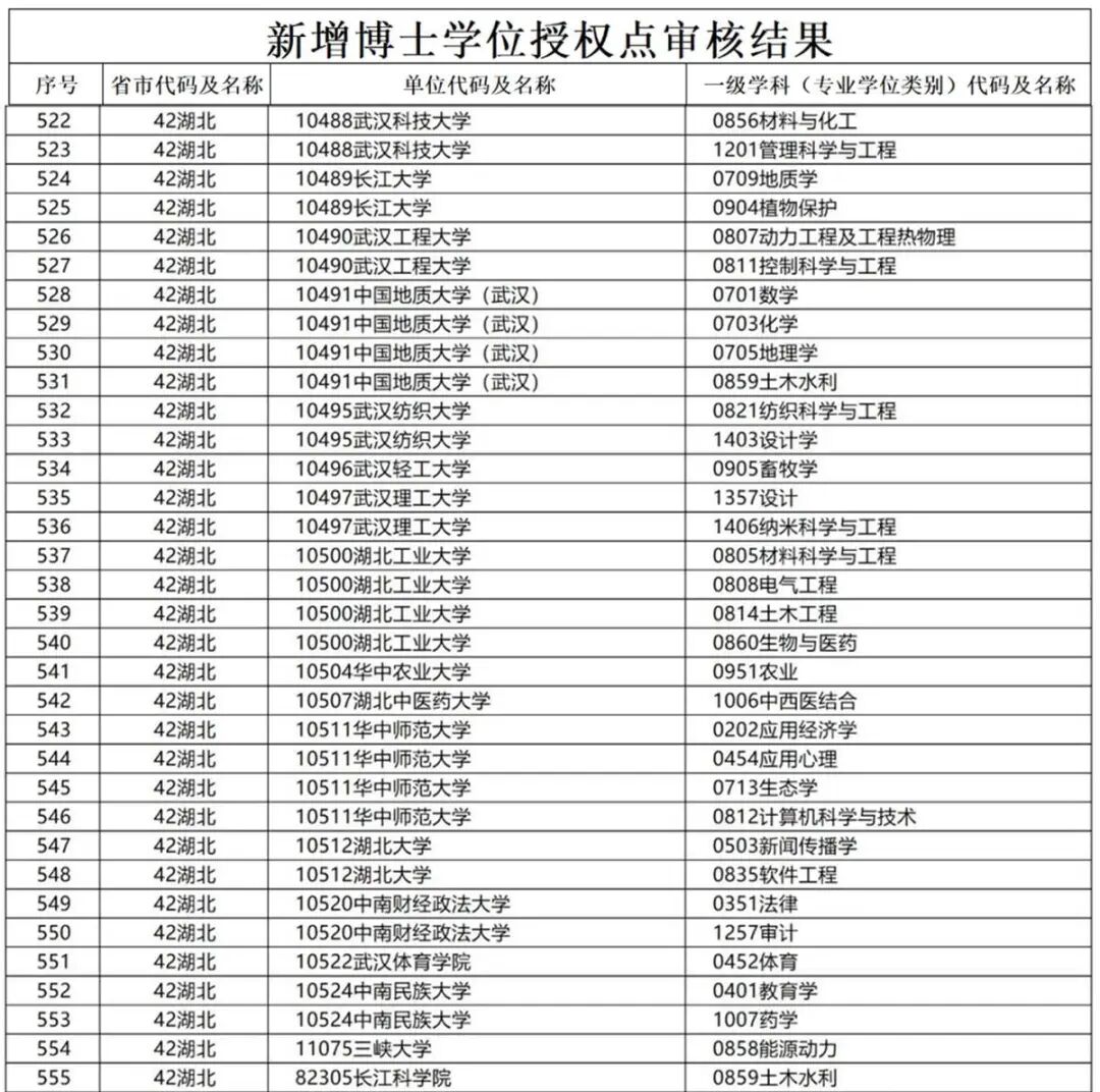 湖北省共有华中师范大学、武汉理工大学、中南财经政法大学、中国地质大学(武汉)、华中农业大学、中南民族大学、武汉科技大学、湖北大学、湖北工业大学、武汉工程大学、长江大学、江汉大学、三峡大学、武汉轻工大学、武汉纺织大学、湖北中医药大学、武汉体育学院、湖北经济学院、湖北美术学院、黄冈师范学院、湖北民族大学、湖北文理学院、湖北汽车工业学院、湖北工程学院、湖北理工学院、湖北科技学院、湖北医药学院和长江科学院、武汉邮电科学院研究所、湖北省社会科学院等高校和科研院所,新增博士硕士学位授权点。