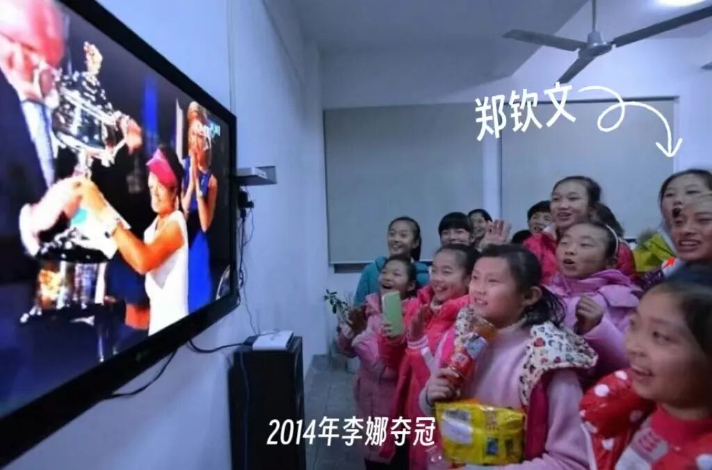 △郑钦文在电视机前观看李娜澳网夺冠