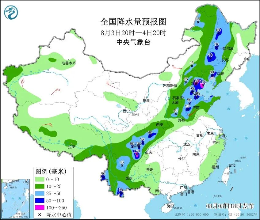 中央气象台3日18时继续发布暴雨蓝色预警,预计3日20时至4日20时,内蒙古东部、黑龙江中西部、吉林中西部、辽宁中北部、河北东北部和中南部、北京东部和南部、天津、山东北部和西南部、河南北部、山西南部、陕西南部、四川盆地大部、云南东北部和西南部等地的部分地区有大到暴雨。