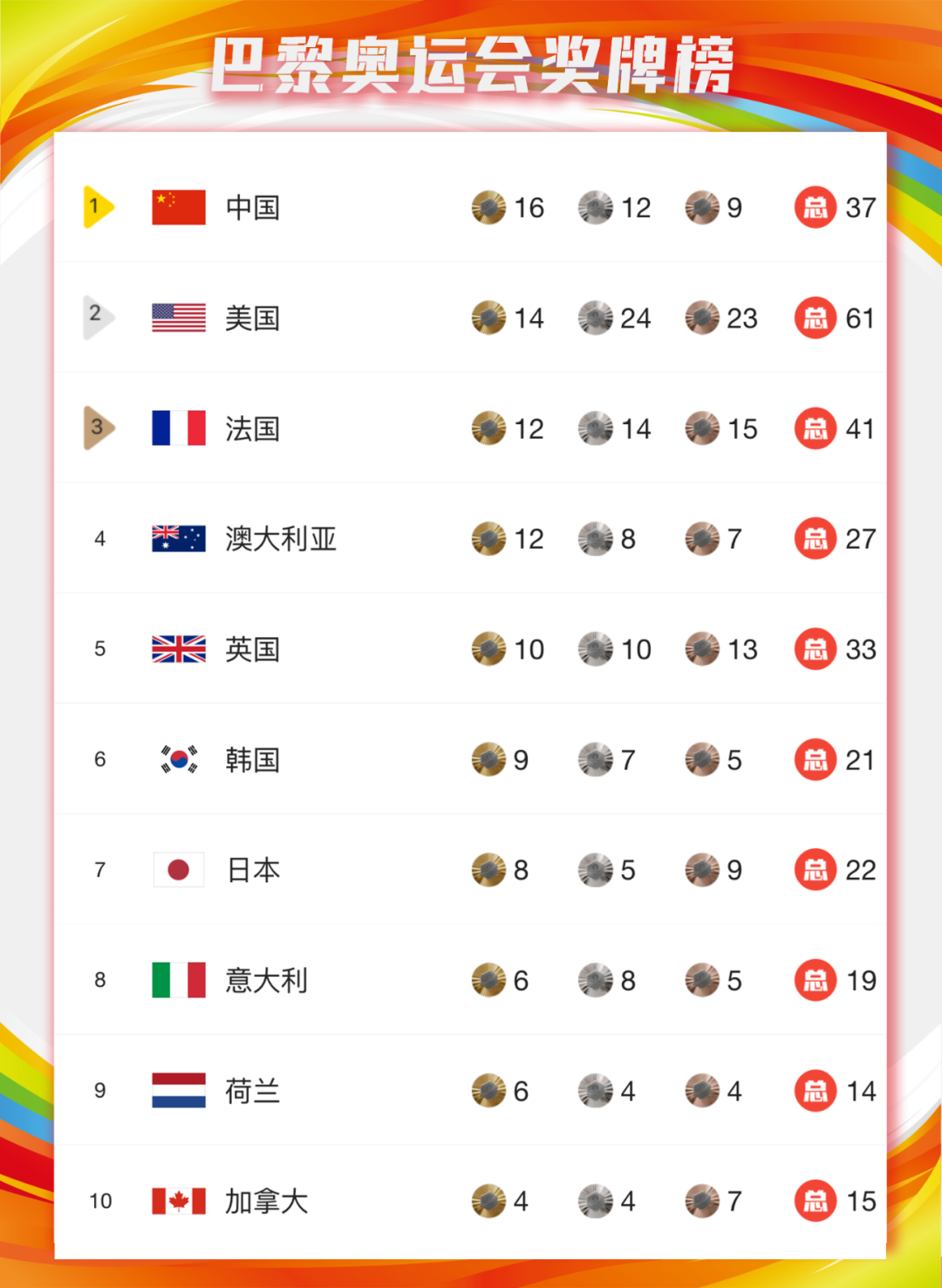 截至巴黎奥运会第八个比赛日,中国代表团共获得16金12银9铜,暂列金牌榜第一。