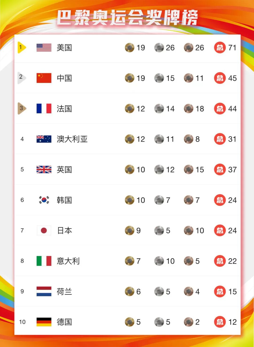 截至巴黎奥运会第九个比赛日,中国代表团共获得19金15银11铜,暂列金牌榜第二。