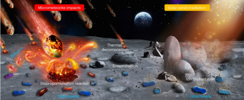 (微)陨石撞击和太阳风辐照对月球表面的风化作用。图片来源:参考文献[1]