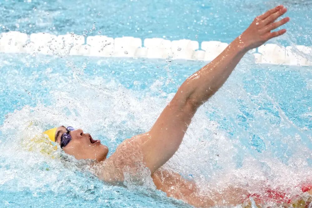 8月3日,中国队选手王长浩在男子4x100米混合泳接力预赛中,最终,中国队以第二名的成绩晋级决赛。新华社记者 薛宇舸 摄