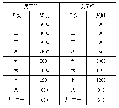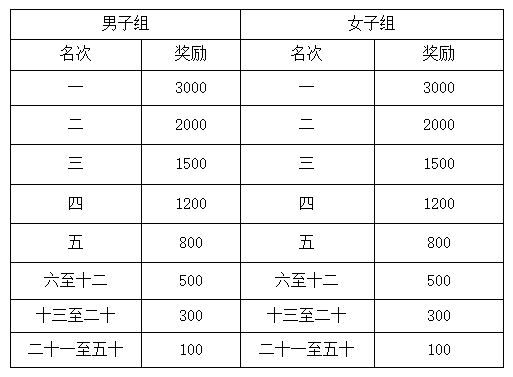 各组按照半程马拉松净成绩进行统一排名,录取前20名运动员,奖励标准为:300元/人/组。