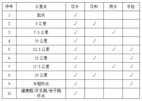 2、补给:赛道沿途12.5公里、15公里、17.5公里、20公里以及半程终点处设置有补给站。