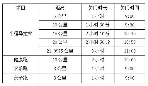 (六)关门距离和时间:为保证参赛运动员比赛安全,限时对社会交通进行滚动封闭。比赛路线各段专设了赛时关门时间,到达关门时间,相应公里点的计时毯停止工作,相应公里点路段将恢复社会交通。在规定关门时间内,未跑完对应距离的参赛运动员须立即停止比赛,退出赛道,以免发生危险。退出比赛的运动员可乘坐组委会提供的收容车或自行选乘公共交通抵达相应项目的终点。关门时间按自然时间计算,具体见下表: