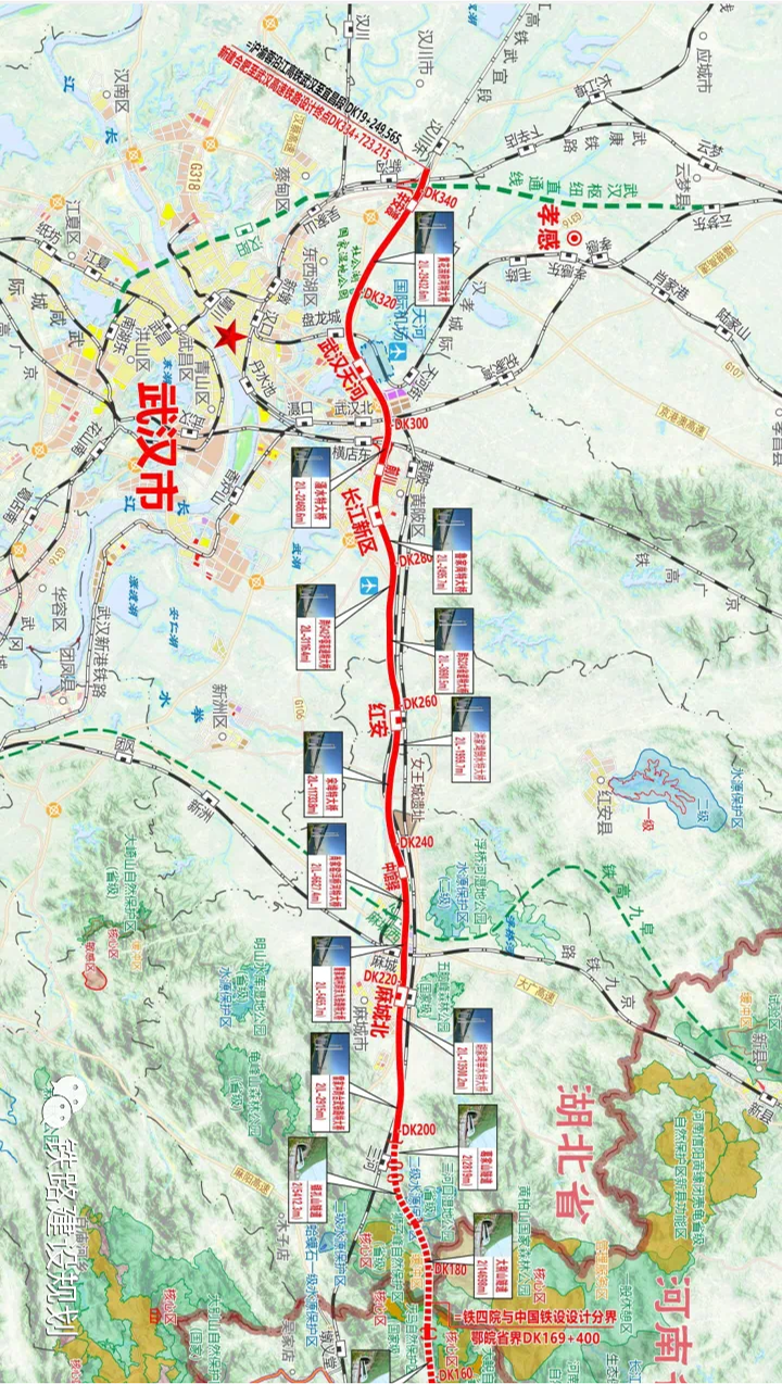 线路东起安徽省合肥南站,途经六安北、金寨东、南溪、麻城北、红安、长江新区,终点到武汉天河站,桥隧比高达88.6%。