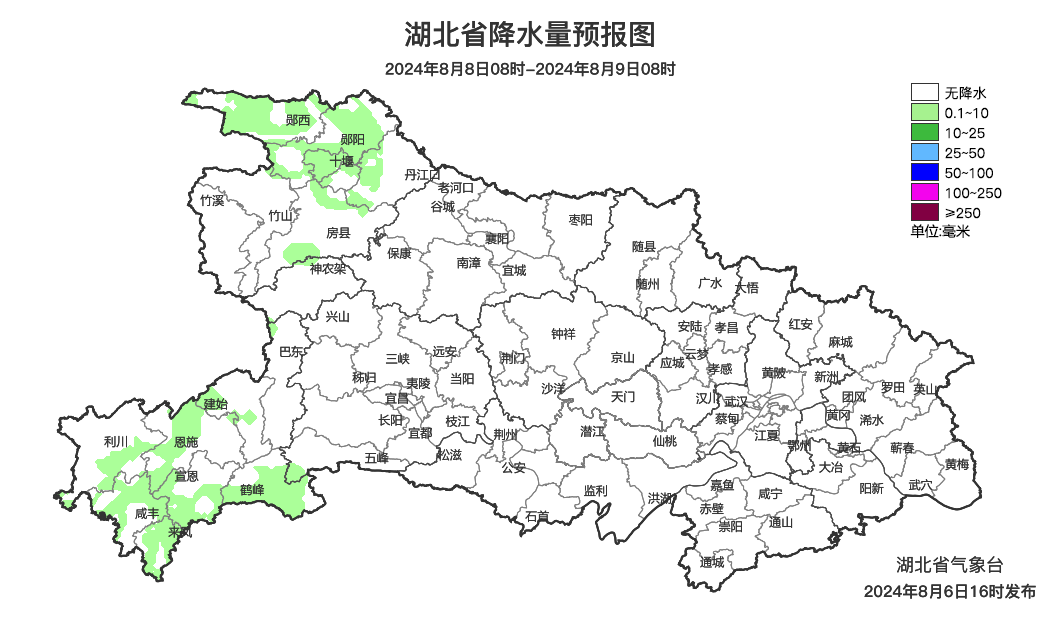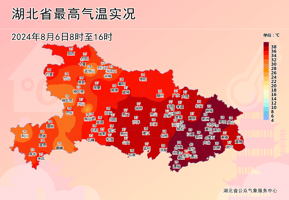 8日08时-9日08时,湖北省晴天到多云,其中鄂西北、鄂西南局地有阵雨或雷阵雨。最高气温36~39℃、局地40℃以上,最低气温25~30℃,偏南风3到4级、阵风5到6级。