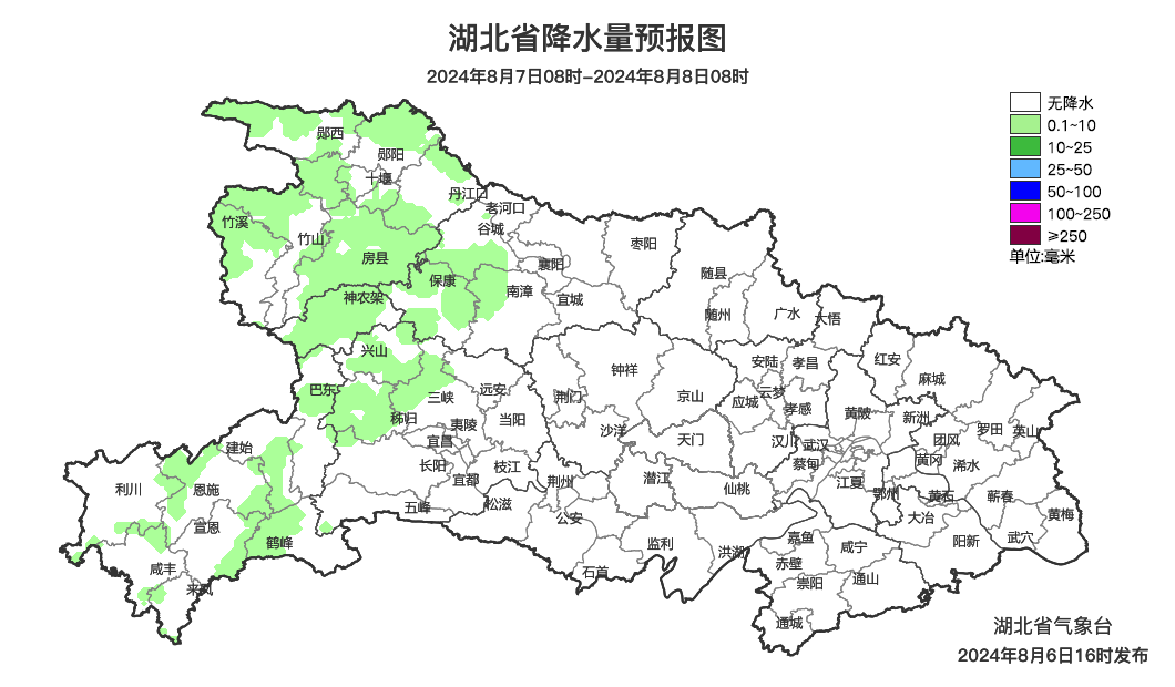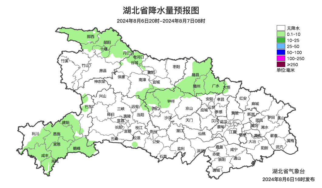 6日20时-7日08时,鄂西北、鄂西南、鄂东北西部多云有分散性阵雨或雷阵雨;其他地区晴天到多云。最低气温25~30℃,偏南风2到3级。