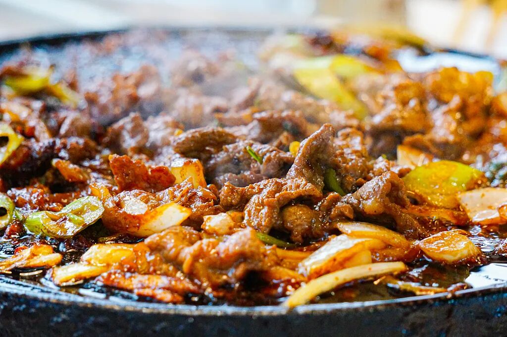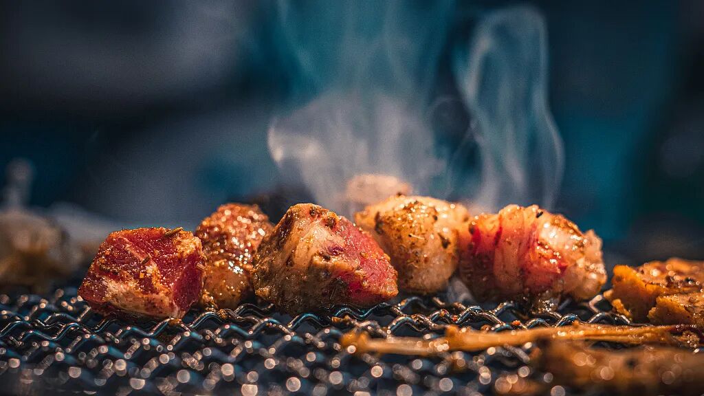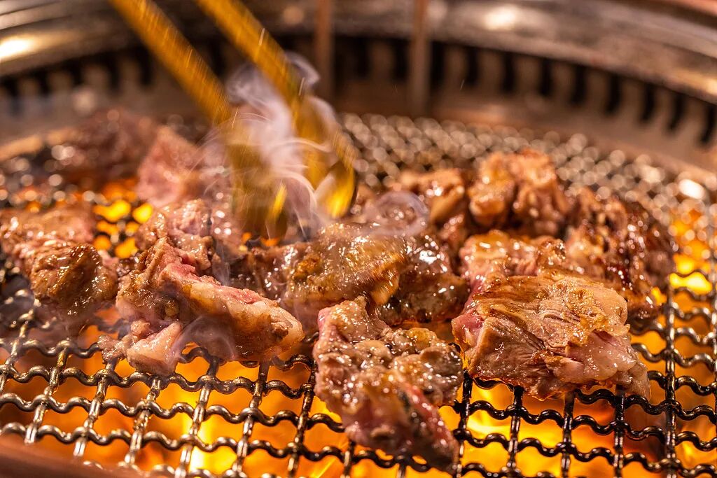 新鲜的牛、羊肉在炭火的熏烤下“滋滋”地跳动着滴落金黄的油脂肉质的香气在烟雾缭绕中四散开来