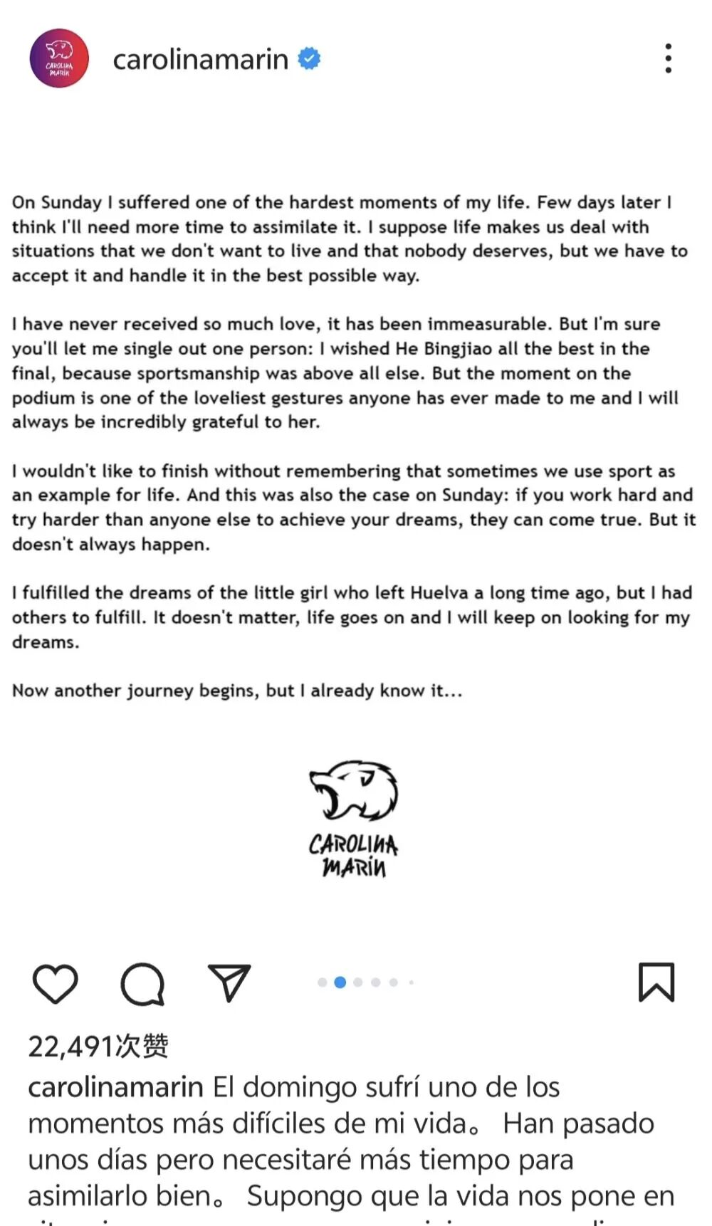 收到众人祝福的马林6日在社交媒体发文,感谢所有给她支持的人,并特别感谢了何冰娇。“我鼓励何冰娇在决赛中有好的发挥,因为这是高于一切的体育精神。她在领奖台上所做的事是我受到的支持中最可爱的举动之一,我会永远感激她。”