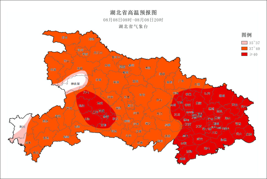 预计8月8日白天,除神农架、恩施高海拔地区外,湖北省大部分地区最高气温将升至36~39℃,其中宜昌、孝感南部、武汉、鄂州、黄石、黄冈、咸宁等部分地区将超过40℃,请注意防范。