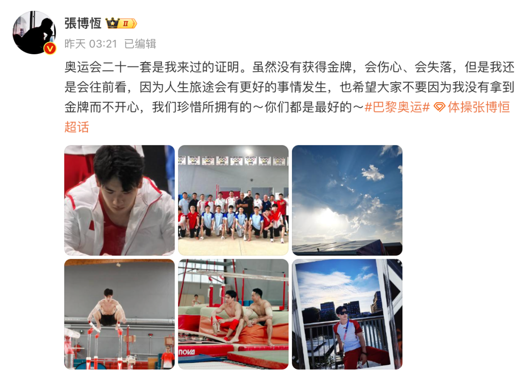 6日凌晨,张博恒发文告别巴黎奥运会:“奥运会二十一套是我来过的证明,虽然没有获得金牌,会伤心、会失落,但是我还是会往前看,因为人生旅途会有更好的事情发生。”