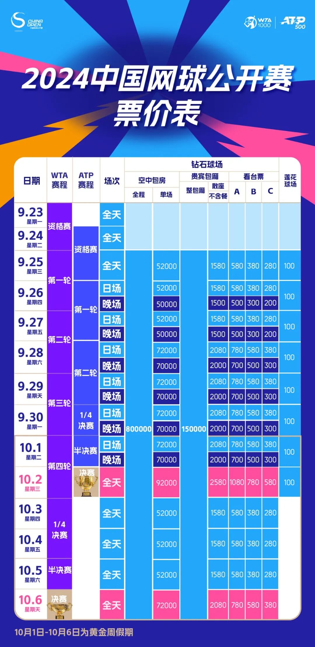 在2024中网(9月23日~10月6日),你可以看到WTA女子赛事、ATP男子赛事和ITF青少年赛事。