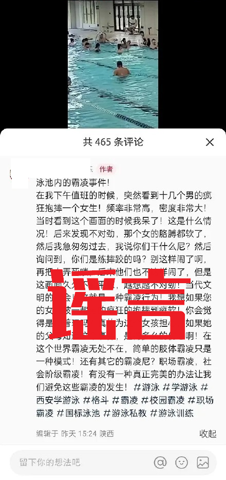 8月17日晚,西安市公安局长安分局微信公众号发布《警情通报》称:近日,网络流传视频“女生在泳池内被男生轮流抱摔霸凌”引发热议。经核实,该视频拍摄内容系同学间的嬉戏场景,任某(男,31岁,系该游泳馆教练)为博眼球给其自媒体账号引流,拍摄视频并冠以“霸凌”“十几个男性轮流抱摔一女子”等虚假内容发布,引发广泛关注。
