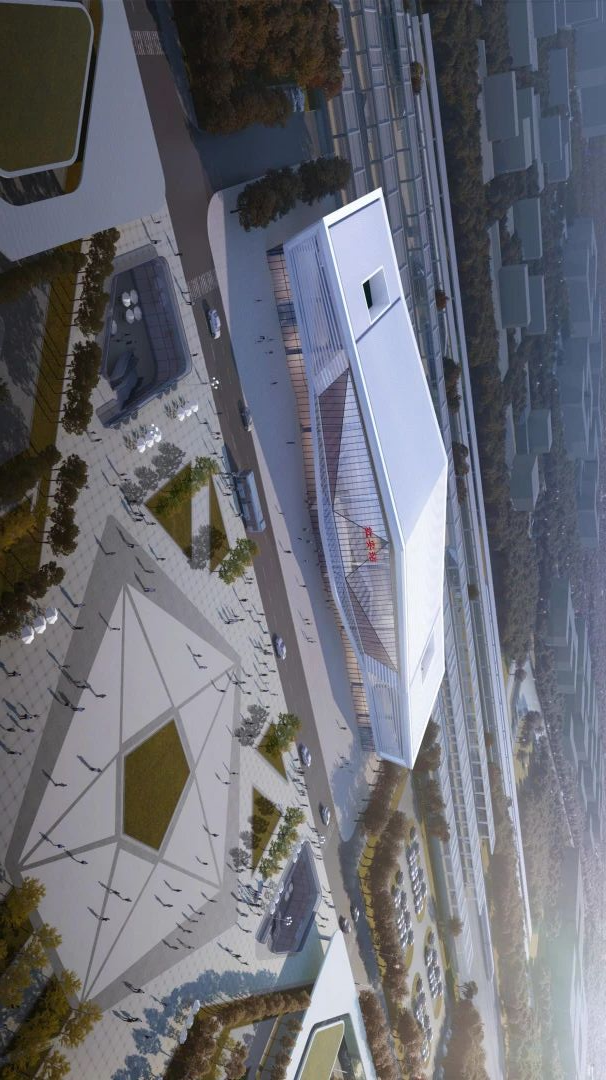 红安站站房以“红色胜地,将星故里,星耀红安”为设计理念,设计方案结合铁路站房的空间特色,形成中间候车厅高、两侧配套用房低的形态,彰显红安“第一将军县”深厚的红色文化和万众一心、朴诚勇毅的革命精神。站房入口部分整体凸出,使幕墙形成三角折面,结合层叠的檐口和立面,勾勒出抽象的“五角星”形态。站房整体形象端庄大气、气势磅礴,极具视觉冲击力。