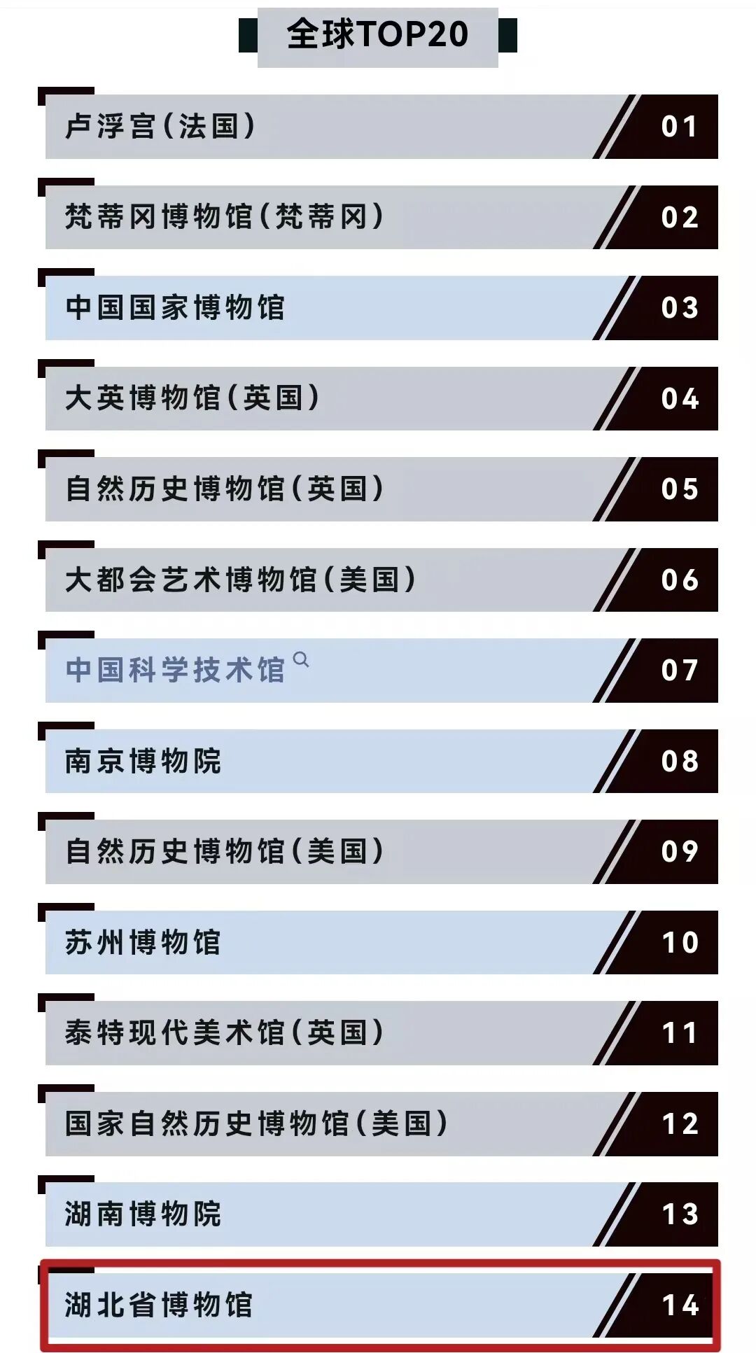 报告显示,中国共7家博物馆上榜全球前20,包括:中国国家博物馆、中国科学技术馆、南京博物院、苏州博物馆、湖南博物院、湖北省博物馆、广东省博物馆。湖北省博物馆位列第14位。