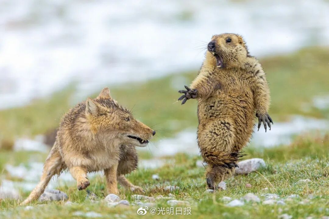 潜伏在喜马拉雅旱獭洞穴附近等待已久的藏狐,以极快的速度扑向自己的猎物 鲍永清摄
