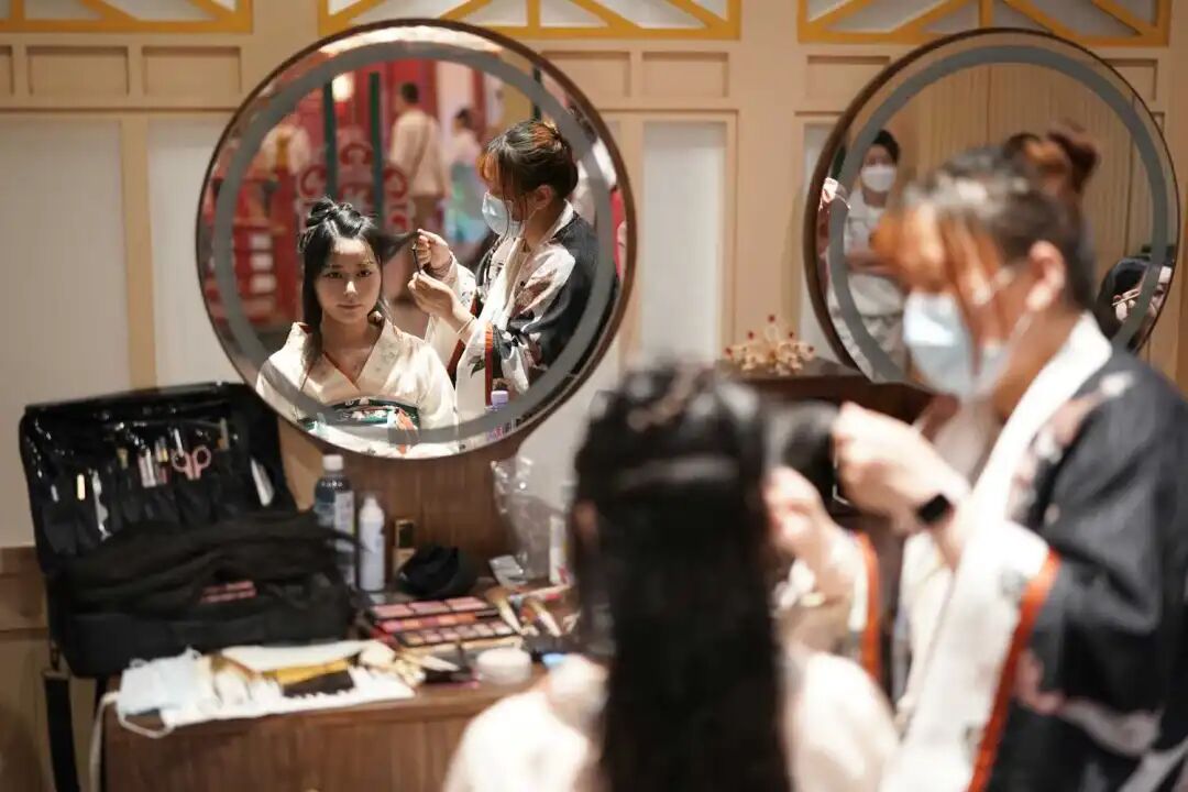 游客在西安长安十二时辰景区进行化妆造型。邵瑞摄(新华社)